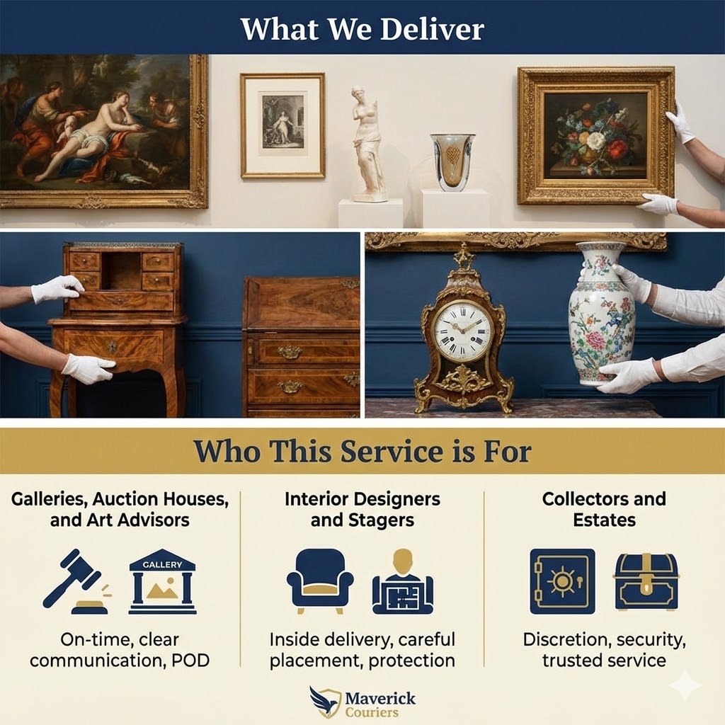 Art and antiques aren’t “just packages.” They’re fragile, valuable, and often one-of-a-kind. Maverick Couriers provides white-glove courier delivery designed for fine art shipping and antique transport so your piece is picked up carefully, moved securely, and delivered with the kind of attention you’d expect from a professional art handler.