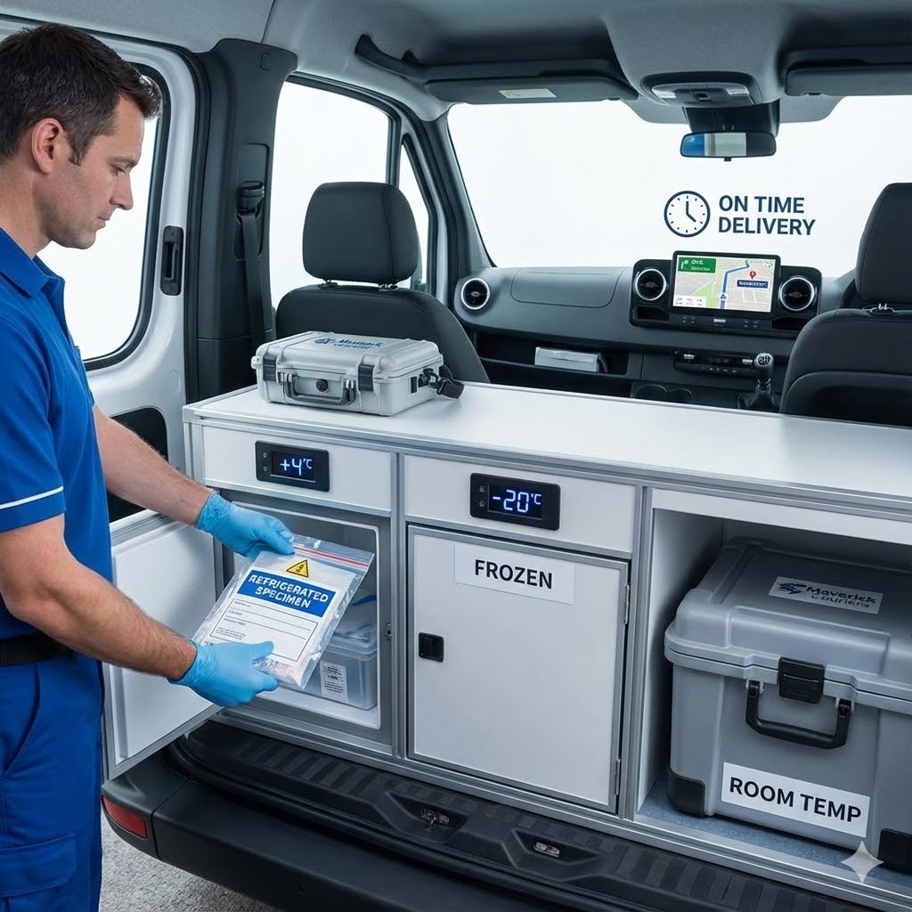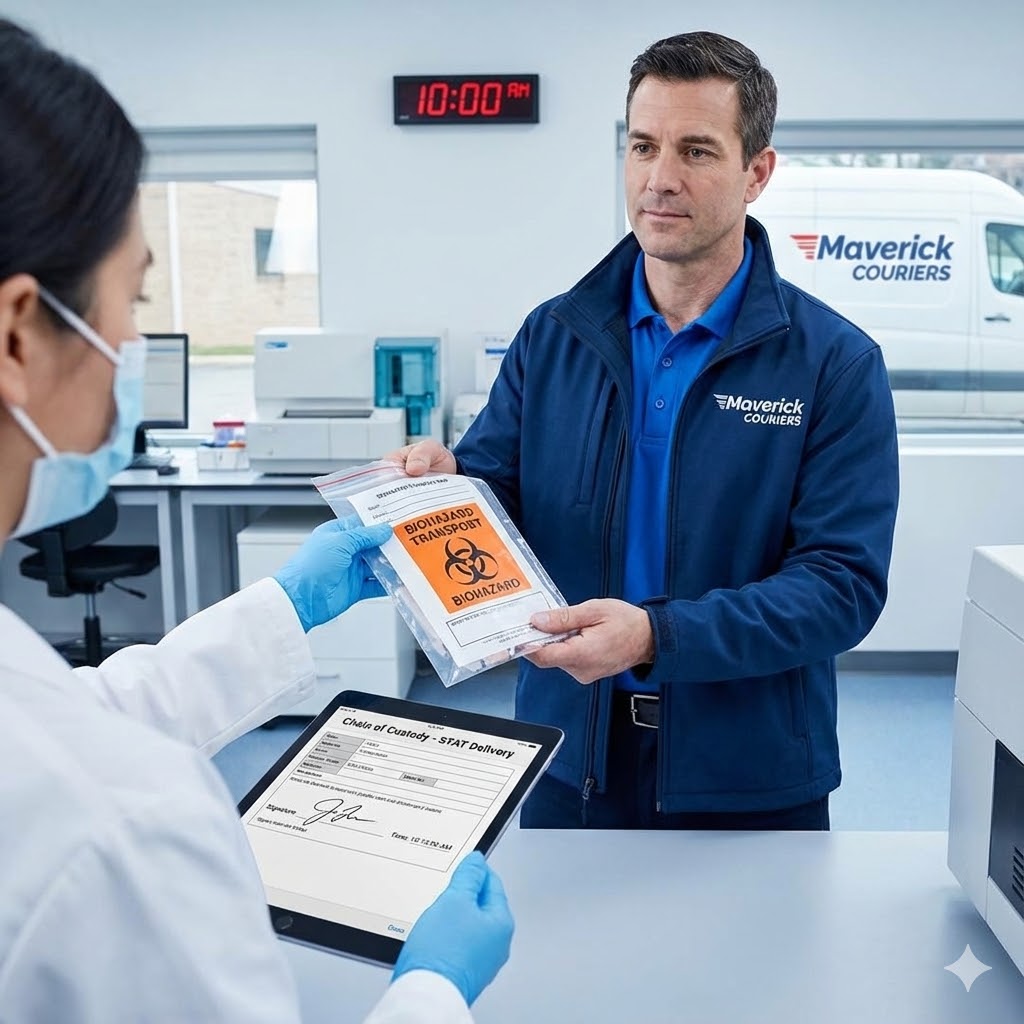 Maverick Couriers provides time-critical medical deliveries for hospitals, clinics, laboratories, imaging centers, and healthcare teams moving blood samples, diagnostic specimens, and critical imaging with documented chain of custody, real-time updates, and proof of delivery (POD).
